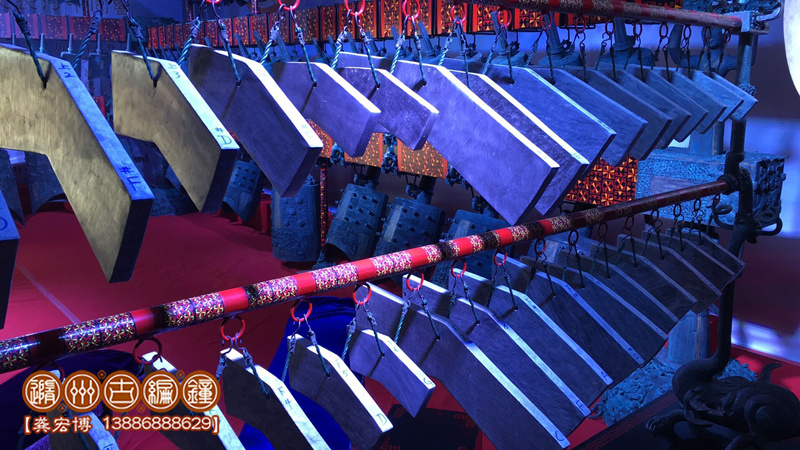 隨州市古編鐘文化發(fā)展有限公司通過考證歷史資料進行研究分析,并八方尋找石源,終于將這套2400多年前的戰(zhàn)國初期大型編磬復(fù)制出來,其發(fā)音與原編磬的標音銘文相符,低音渾厚洪高,高音明澈,音色優(yōu)美而動聽,音域達三個八度,可以旋宮轉(zhuǎn)調(diào),演奏多種樂曲。