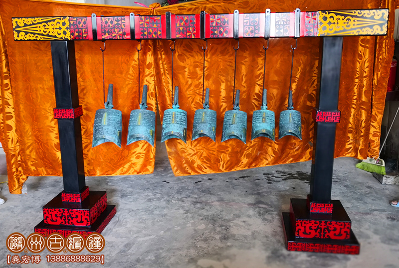 隨州古編鐘公司按客戶要求制作7件仿古編鐘,長2.35米×寬0.45米×高1.5米。編鐘外形按照聞名世界的隨州曾侯乙編鐘仿制,編鐘為青銅鑄造;采用標(biāo)準(zhǔn)音音高A=440Hz調(diào)音1——7,要求聲音清脆悅耳,有延續(xù)音,無啞音編鐘,編鐘大梁采用優(yōu)質(zhì)板材制作,表面按設(shè)計噴漆,彩繪花紋,配套演奏木錘1把,包裝木箱。