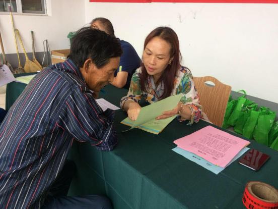 志愿者為農(nóng)村剩余勞動(dòng)力介紹潔霸公司招工簡章 村民們認(rèn)真閱讀招工簡章。
