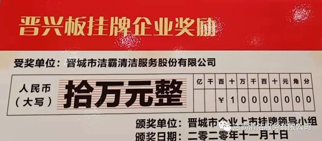 晉城市潔霸清潔服務(wù)股份有限公司于2019年11月27日成功登陸山西股權(quán)交易中心“專精特新板”(晉興板)(企業(yè)代碼:060200Z),是“專精特新板”開板暨首批掛牌的14家企業(yè)之一。“專精特新板”是山西股權(quán)交易中心設(shè)立的特色板塊,為省內(nèi)具備專業(yè)化、精細(xì)化、特色化、新穎化的優(yōu)質(zhì)企業(yè)提供專屬服務(wù),成為帶動全省中小企業(yè)創(chuàng)新創(chuàng)造、轉(zhuǎn)型升級,壯大工業(yè)高質(zhì)量發(fā)展的生力軍!皶x興板”掛牌,標(biāo)志著公司正式進(jìn)軍資本市場,豐富了融資渠道,推動公司高質(zhì)量轉(zhuǎn)型發(fā)展,成為公司發(fā)展的新引擎。