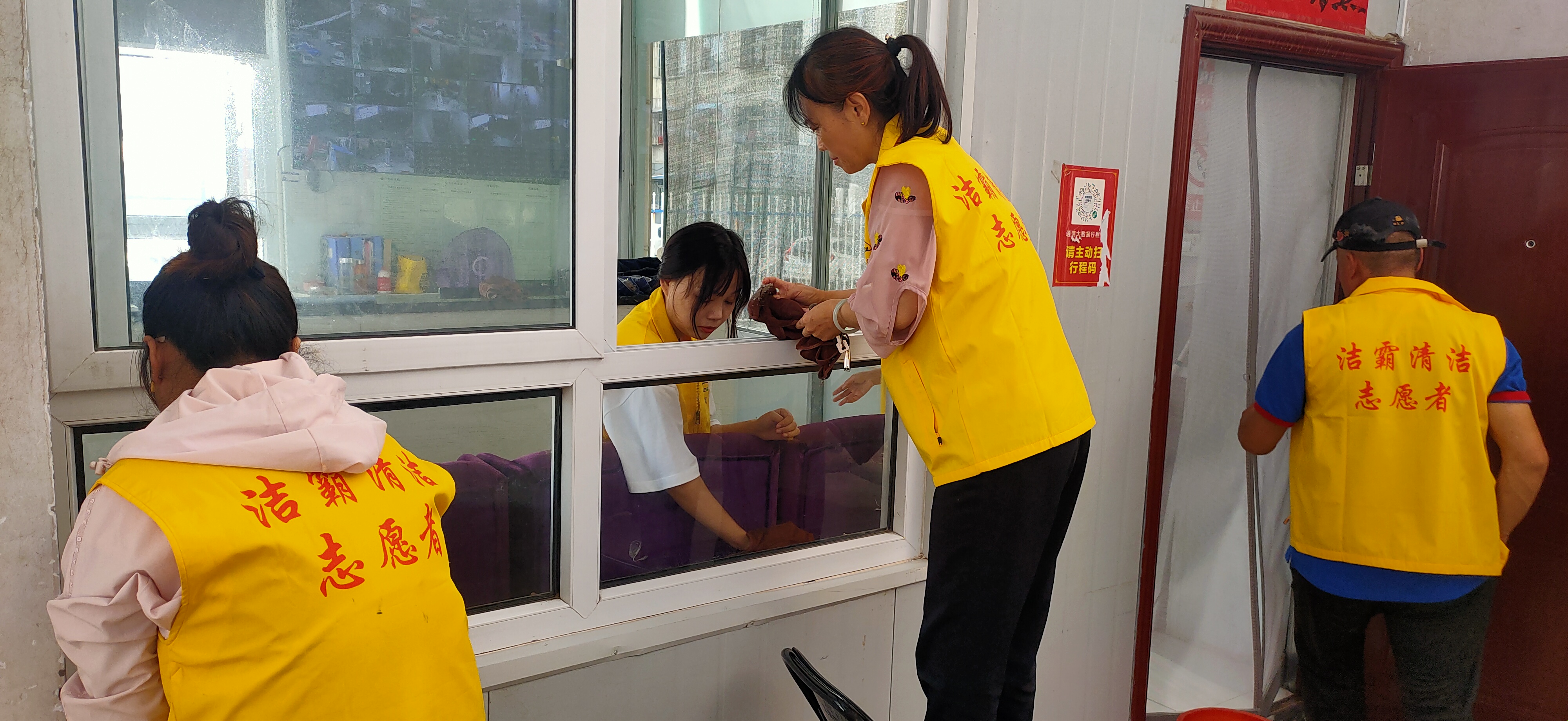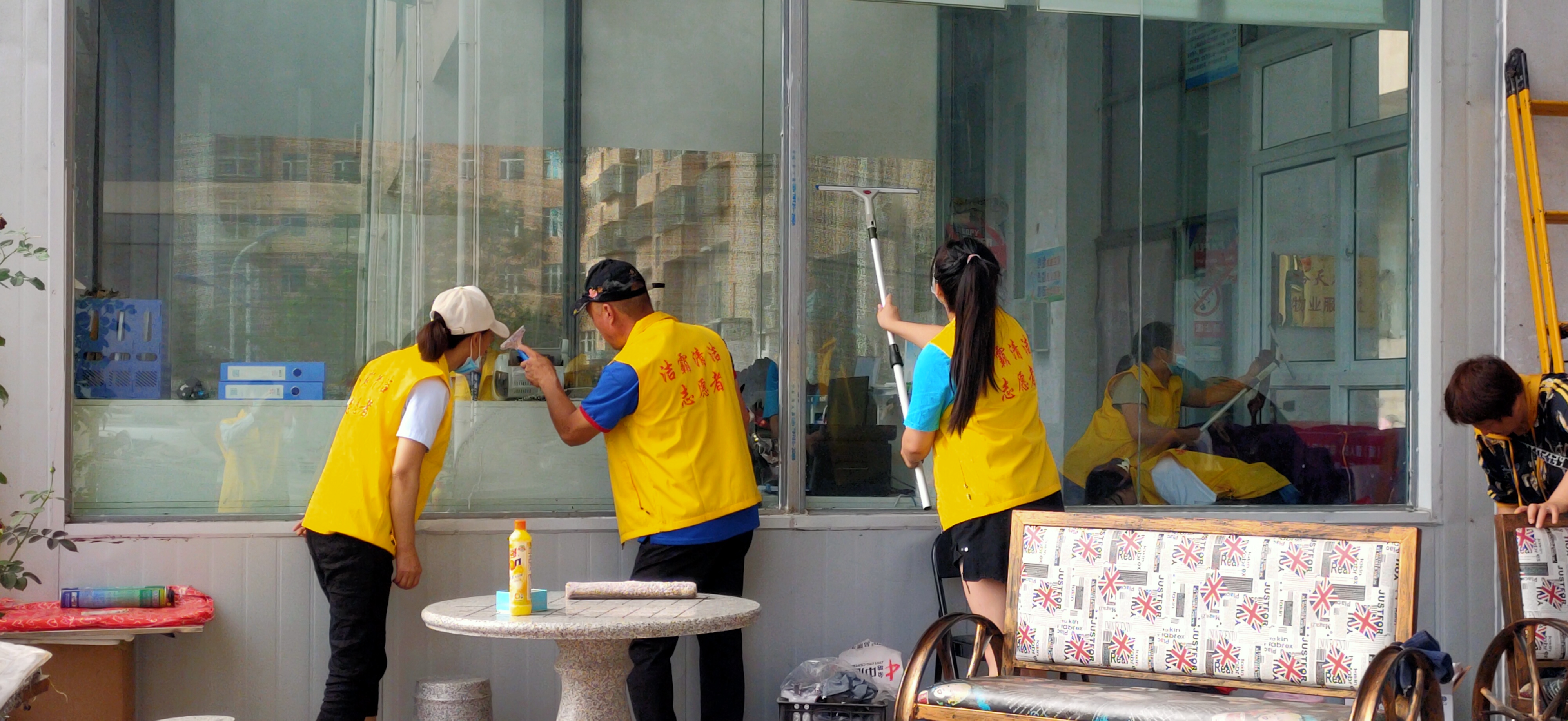 活動(dòng)現(xiàn)場,志愿者身穿黃色馬甲,自帶玻璃擦、毛巾、笤帚、簸箕等清潔工具,對小區(qū)物業(yè)服務(wù)處及小區(qū)環(huán)境進(jìn)行清潔打掃。他們有的清掃小區(qū)天臺(tái)上的垃圾;有的清理樓道門及公共設(shè)施上的牛皮癬;有的擦拭門衛(wèi)的玻璃;有的清洗紗窗;有的清洗物業(yè)服務(wù)處的玻璃幕墻……志愿者個(gè)個(gè)干勁十足,不怕臟、不怕累,經(jīng)過一個(gè)多小時(shí)的團(tuán)結(jié)協(xié)作,小區(qū)環(huán)境煥然一新。