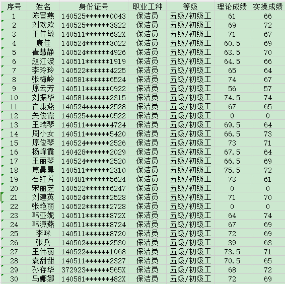 | 晉城市潔霸清潔服務(wù)股份有限公司職業(yè)技能等級(jí)認(rèn)定中心 2024年8月18日第30批保潔員初級(jí)認(rèn)定人員成績(jī)公示       晉城市潔霸清潔服務(wù)股份有限公司職業(yè)技能等級(jí)認(rèn)定中心現(xiàn)將2024年8月18日認(rèn)定人員成績(jī)公示如下: